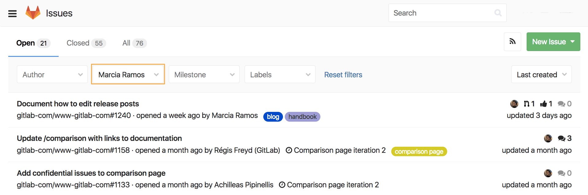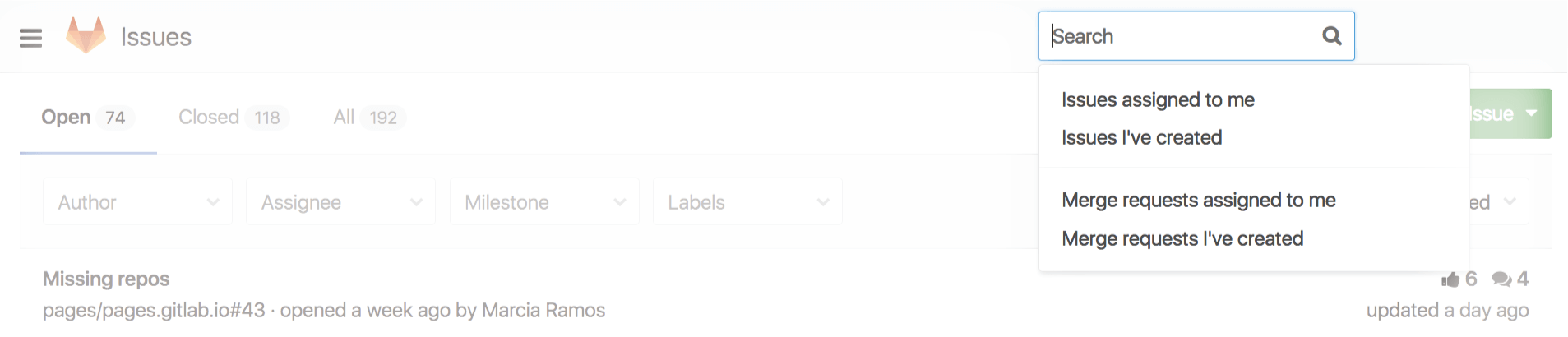 You can filter them by Author, Assignee, Milestone, and Labels, searching through Open, Closed, and All issues.