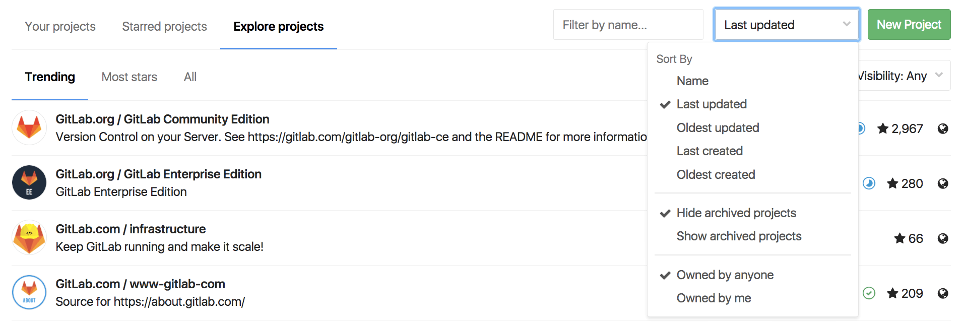 You can also sort them by Name, Last created, Oldest created, Last updated, Oldest updated, Owner, and choose to hide or show archived projects: